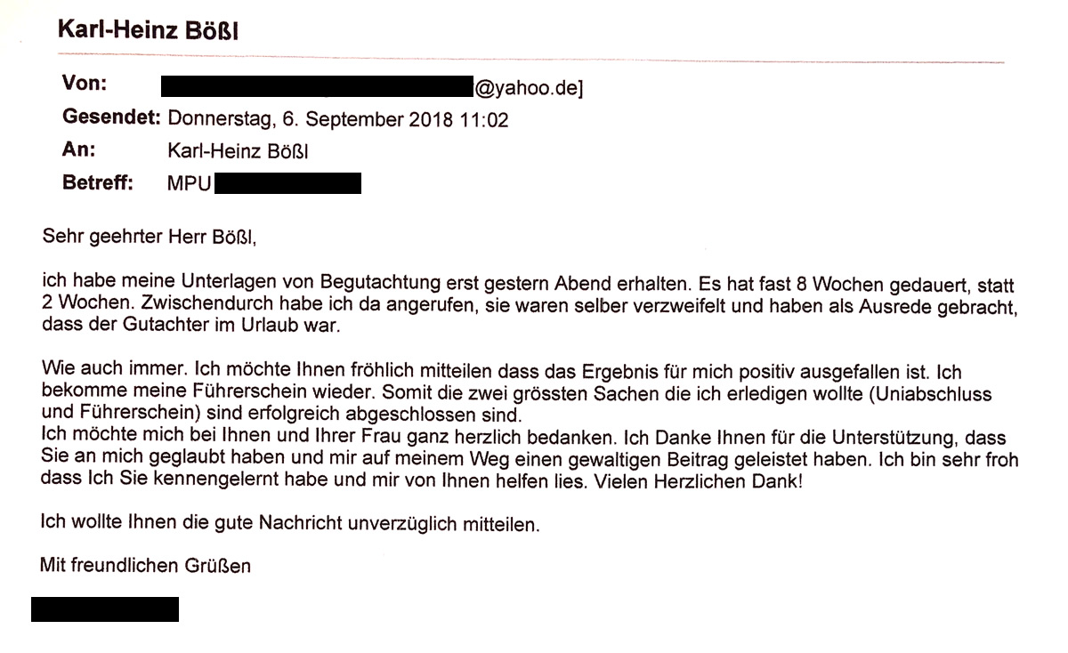 Einige Briefe und E-Mails unserer MPU-Patienten. Mit einem Klick auf das Vorschaubild können Sie das Schreiben lesen.